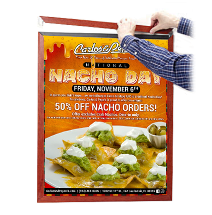 There's no other framing system like it. Our patented 12x16 poster frames, "SwingFrame" features hidden hinges and gravity lock. The beauty of the SwingFrame is that once it's wall mounted, you can't tell that it swings open. Just swing open. Place your 12x16 poster or other insert. Swing Close. Unlike permanent 12x16 picture frames, you don't have to dismantle the SwingFrame to update your marketing materials. thus making changing posters, other printed graphics and signage easy.