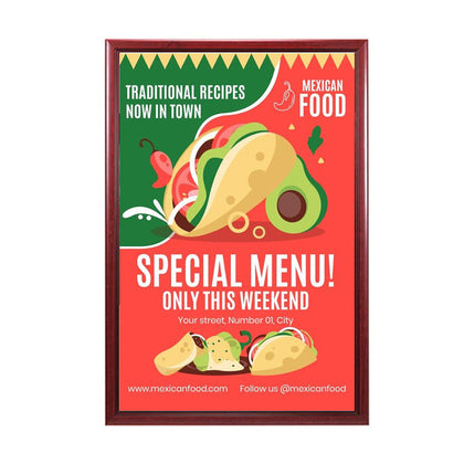 10 Wood Stained Finishes are designed to compliment numerous commercial and residential interior decors. Choose from these wood frame finishes: Black, Cherry, Charcoal, Dark Green, Dark Mahogany, Honey Pecan, Natural Clear, Rich Walnut, Walnut Stain, or a White Wash Wood Frame
