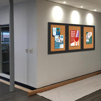 Choose from 4 metal framed display case finishes; Black, Satin Gold, Satin Silver and Bronze. Want more color for your 2 door message display board 72 x 48 size? Add fabric covered cork offered in 10 colors or choose from 4 painted cork colors. Order and receive Free Shipping on these 3 Door Cork Board Message Centers.