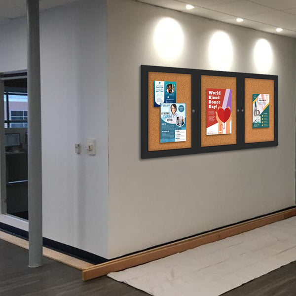 Metal framed 72 x 48 "SwingCase" Indoor enclosed bulletin board has three lockable doors. Each door has continuous solid steel hinges and a clear break resistant Lexan Polycarbonate window. These wall display boards are secured with front cam locks (2 Keys are included). Tempered Glass is optional.