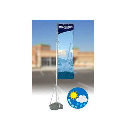 This sign stand comes with a fillable base and pole for upright stability. The weighted base can be filled with water or sand for additional ballast support load if needed. It's also adjustable. The Tracker design stands up securely with a telescopic pole system and four 3/4" #3 grommets to hold one of four available graphic sizes.