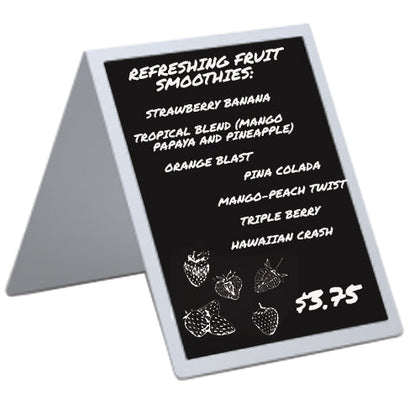 For more visibility, place this black marker board sign holder on an elevated surface, and it becomes a versatile standing marketing display. Freestanding, satin finish anodized aluminum counter top message boards are built to last and represent clean, sleek aesthetic pleasing indoor displays.