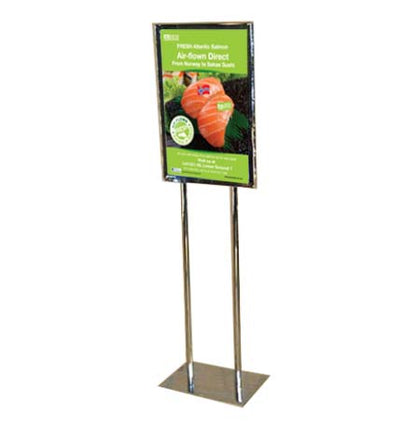 - 14x22 Heavy Duty Economy Sign Holder with Tubular Base. Use this top-loading sign frame to showcase up to two graphics without difficulty. The top-loading frame also makes poster changes quick and simple so that you can start advertising in no time! A 14x22 floorstand is an excellent option for any indoor location; this size is noticeable but will not obstruct any walkways or aisles. The unique tubular base makes this poster display stand lighter than other models, allowing for trouble-free movement to new locations within your store. In addition, the tubular base, made of solid steel, adds extra stability to the aluminum sign frame. So start posting your advertisements with this affordable free standing sign holder.