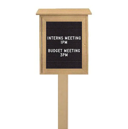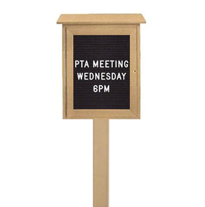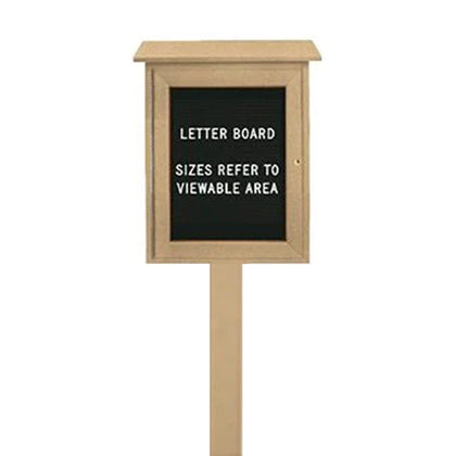 The High-Density, Eco-Friendly Polyethylene construction of this exterior letter board gives it advantage over other tradition wood outdoor message centers i.e. our 16x34 Letter Board will never Crack, Split or Rot from the Weather. In addition to protection from the weather, the enclosed letter board features a Front CAM Lock and a Break-Resistant Acrylic Window fixed to a Top-Positioned Hinge. This deters possible tampering and vandalism while the exterior notice board is installed in your outdoor location. You can also order our 16x34 Changeable Plastic Letter Board with a Single Leg Post. The Post attaches to the bottom of the through a pre-drilled hole. The Leg Post then firmly roots your outdoor information board 3 ft. in-ground.