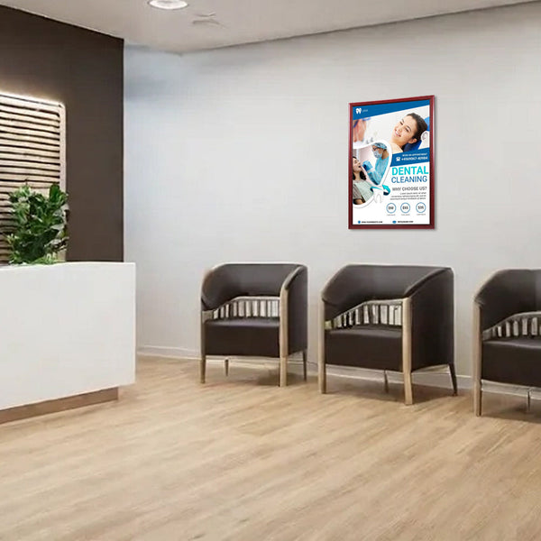 SwingFrame #353 Wood 27x40 Poster Frame has the style and fast change functionality that's ideal as a retail store display and for corporate offices and other indoor environments such as: auto showrooms, museums, trade show and convention facilities, medical centers, hotels, resorts and casinos, quick service to high end restaurants, financial institutions, movie theatres, sports and entertainment centers, government agencies and military bases.