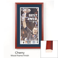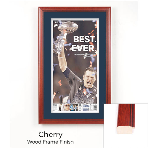 Access Display Group, Inc. Wood Newspaper Frames are built to order. When your team makes the headlines, like the New England Patriots winning the 2017 Super Bowl, Making it Five Super Bowl Wins, we can frame it. By framing your newspaper you can treasure that historic moment every time you see it.