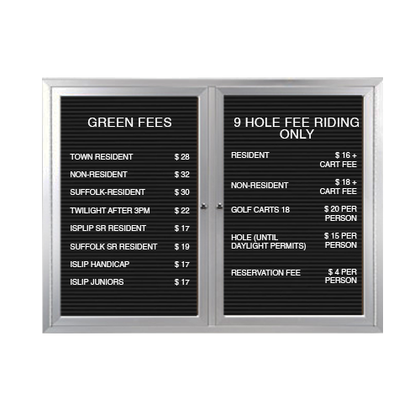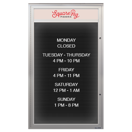 Enclosed Letter board cabinets are secured with front door Cam Locks. Each frame door has a continuous solid hinge and features Polycarbonate shatterproof acrylic window for clear message viewing. Cabinets are reinforced with additional aluminum backing for outside use.