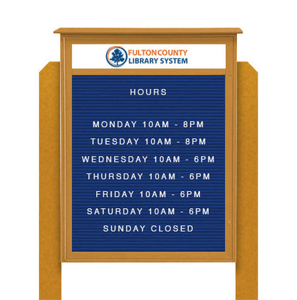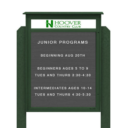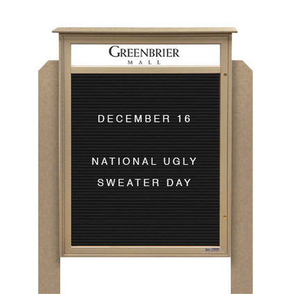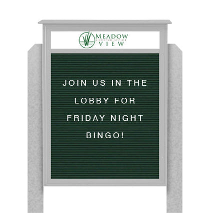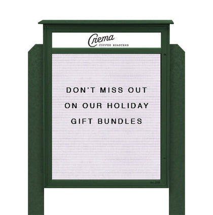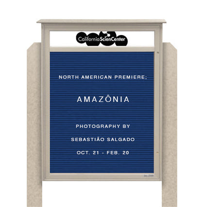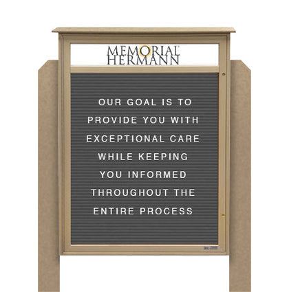Personalize your outdoor letter board stand with a custom header. Many of our message centers feature a header panel that you can use to display your brand, school name, or any other printed message. Using a header is an excellent way to let viewers know who posts or what is posted in the display cases. We offer free printing for your heading in 3" capital black Helvetica lettering. You can also leave your header blank, a great option if you'd like to print your title elsewhere. Contact our customer service for more information about getting a logo or special colors and fonts printed on your header.