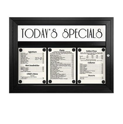 Provide Your Header Text When Ordering Menu Menu Display cases with Message Header and Lights. We'll print it on a black or white cabinet panel in 3" all cap Helvetica letters. For example, add your restaurant name, Tommy's Crab Shack. Or a message; TODAY'S SPECIAL. Or a simple word, MENU. We'll print it free. You can also send us your custom logo or request a different font style. Call customer service for more info. These custom printed enhancements necessitate a small upcharge.