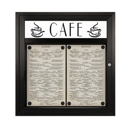 Displaying your menus in an outdoor display case is one way to attract customers to your restaurant. To attract even more customers, present a display case with a header panel with your restaurant name, logo, or other graphic. Our "SwingCase" Menu Case with Header lets you decide the text that goes on the header panel located above the menu display cabinet.