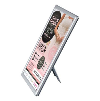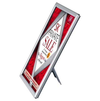 Ad Promo Frames are more than just sign display frames, these eye-catching fast change advertising frames and promotional sign frames are economical and cost effective picture frame solutions to make sure your messages and graphics get noticed throughout your retail store, organization or corporate facilities. These patented snap frames also known as clip frames and grip frames come in 5x7, 8x10, 8.5x11 and 11x17 frame sizes, are ideal as table top sign holder frames and can also be wall mounted portrait or landscape. The aluminum snap open frame has a built-in stand that tilts the frame back at a favorable viewing angle. Place these colorful opti frame designed sign frames easily on shelves, on or near product displays, on top of boxes, counters, tabletops, cabinets –wherever your message or announcement can be most effective.