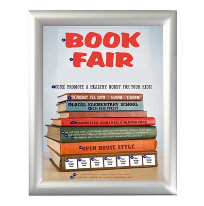 Always an effective promotional marketing sign holder to consider in all kinds of indoor locations. These ceiling hanging snap frame display can have a big impact for sale promotions, notices, and advertisements. Get views from both sides of the sign frame. This indoor ceiling mount frame is displayed in 4 popular portrait size frame; 8.5 x 11”, 11” x 17”, 22” x 28” and 24” x 36”. Print either one or two sign inserts for single or double-sided viewing. Popular Silver Finish Ceiling Snap Frame has a 1” wide metal profile with mitered corners that’s made with durable aluminum. Snap open the frame to quickly and easily front load your signage. Snap Frames come with hanging cables, hooks and mounting screws.