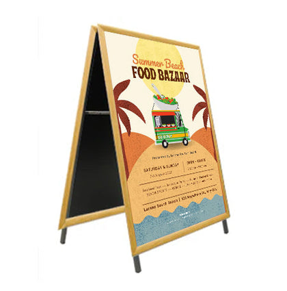 Our contemporary wood-style A-Frame Sign Holder design enhances your indoor and outdoor posters and signs. This versatile stand is perfect for a variety of location settings, including retail stores, trade shows, convention centers, showrooms, and more.