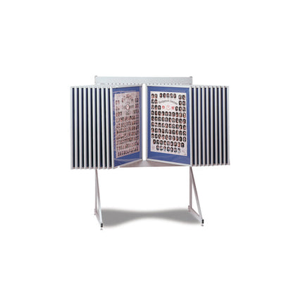The 12 steel-framed panels offer two-sided Viewing. Also, each of these 12 swinging panels features white corrugated insert dividers and two protective vinyl sheets.