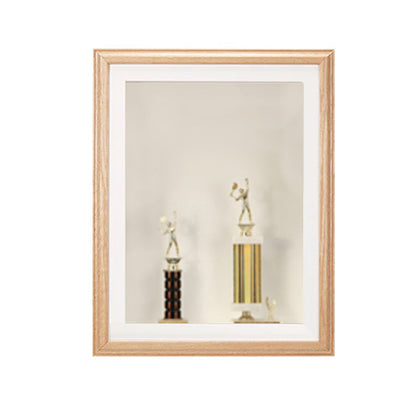 Oak Framed Shadowbox Displays come in three wood frame finishes, Light Oak. Medium Oak, and a Dark Oak. The swing-open display case is designed with a contemporary custom oak wood picture frame profile hinged to a sturdy laminated wooden display case. These display cabinets come with a break-resistant clear plexiglass window and are enhanced with a black or white matboard border. The beveled matboard compliments the oak wood front door profile by giving the wall display case an elegant picture frame style. Choose shadow box display case depths of 1", 2', 3' and 4" in all 12 standard large shadow box sizes. If a display case size is not listed, we can build a wall mount custom display case that works for your project needs. Although the cabinet is designed with a sliding gravity lock, we can install an optional side plunge lock and key if a more secure lockable display case is necessary.