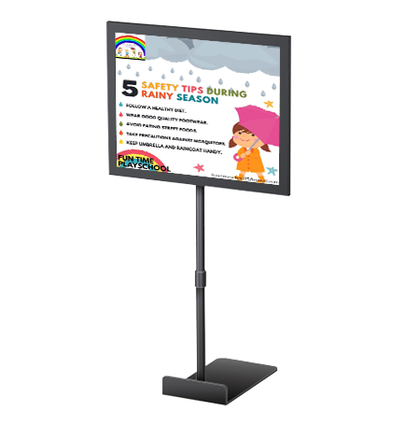 The portable, 11x14 lightweight countertop pedestal display is made of steel and built to last and represent a clean, sleek aesthetic. Updating your signage message is simple. Slide your 1/16" graphic card into the frame's top slot opening.