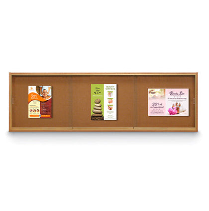 Enclosed in the 84x30 indoor wall mounted bulletin board's corrosion-resistant Anodized Aluminum frame is a self sealing corkboard to pin important announcements, schedules, graphics, signage, office memos, restaurant menus, permits, etc. Your displayed information will be protected by a ratchet lock that secures the three sliding glass doors.
