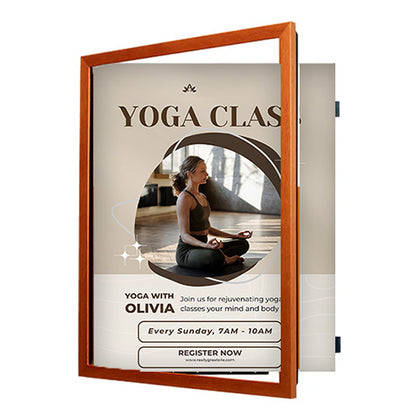 The SwingFrame #353 wood wall mount display frame with matboard effectively presents signage in showrooms, financial institutions, medical centers, as well as restaurants, theatres, and entertainment centers, hotels and resorts and may other interior spaces that need a high quality style that fits any décor.